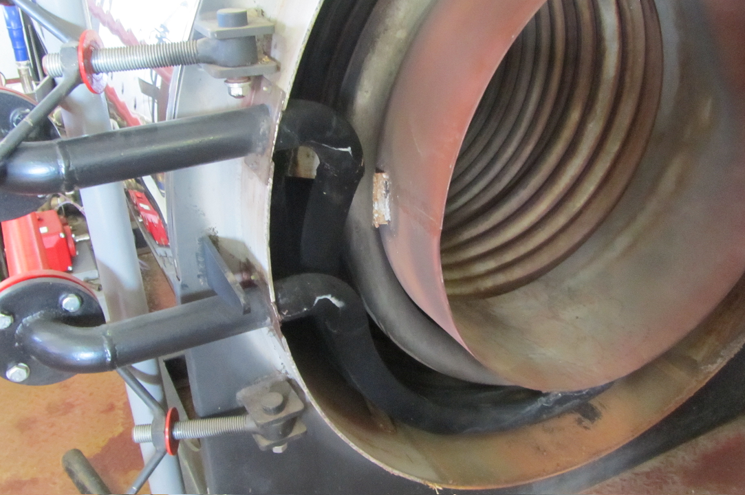 | Преимуществом скоростных парогенераторов является быстрая готовность к работе с коротким временем разогрева. Это важно в том случае, когда котел должен быть постоянно готовым к производству пара или при работе с пиковыми нагрузками. В таких случаях при использовании жаротрубного дымогарного котла пришлось бы слишком долго ждать разогрева до нужной температуры. Поэтому даже при малых мощностях скоростные парогенераторы должны иметь двухступенчатую схему работы, так чтобы автоматически регулировались подача воды и топлива. Это снижает частоту включений горелки при переменной нагрузке. Частые включения являются недостатком скоростных парогенераторов по сравнению с жаротрубными дымогарными котлами. Скоростные парогенераторы не имеют накопительных емкостей для воды и пара. Такой недостаток должен сглаживаться подачей топлива и его регулированием. Это ведет к частым переключениям "вкл.-выкл." или "частичная нагрузка – полная нагрузка". В результате этого органы управления и регулирования подвержены повышенному износу. Кроме того, при каждом розжиге возникает небольшой сажевый удар (фото №2), что обуславливает более короткие промежутки времени между чистками поверхностей нагрева по сравнению с жаротрубными дымогарными котлами. Частые включения-выключения горелки являются причиной повышенного расхода топлива, так как перед каждым розжигом горелки топочная камера продувается свежим воздухом для предотвращения опасности взрыва. Таким образом, горячий воздух выходит через дымовую трубу. | ||||